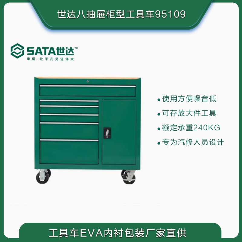 西安世达工具8抽屉柜型工具车带木质台面高档手推车95109车间存储5S